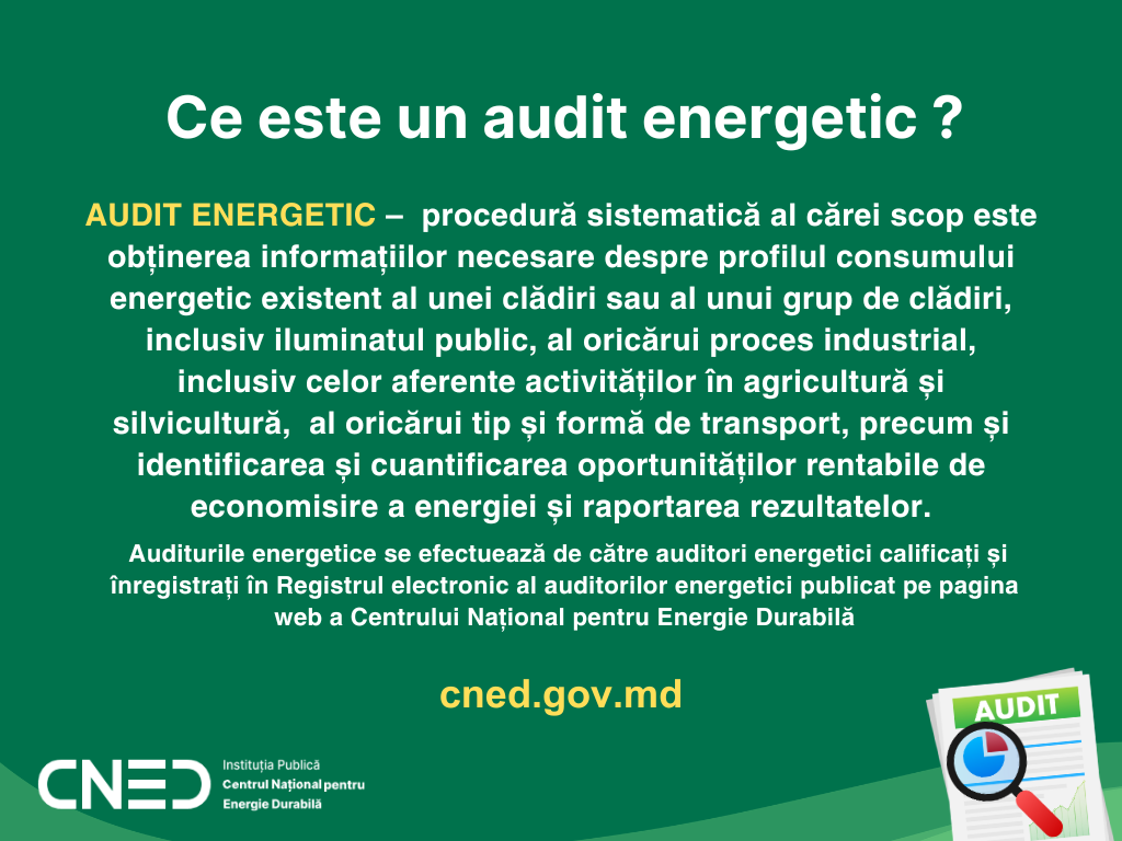 Odată cu aprobarea Legii nr. 139/2018, țara noastră a transpus în legislația națională Directiva 2012/27/UE a Parlamentului European și a Consiliului din 25 octombrie 2012 privind eficiența energetică, prin crearea cadrului juridic necesar pentru promovarea și îmbunătățirea eficienței energetice, inclusiv prin punerea la dispoziția tuturor consumatorilor finali a auditurilor energetice calitative efectuate de către auditori energetici calificați. Astfel, în vederea calificării auditorilor energetici, a fost elaborat Regulamentul cu privire la auditorii energetici și auditul energetic, aprobat prin Hotărârea Guvernului nr. 676 din 10.09.2020 (HG 676/2020). Auditorii energetici pot fi calificați și înregistrați în Registrul electronic al auditorilor energetici pentru una sau mai multe categorii, după cum urmează: