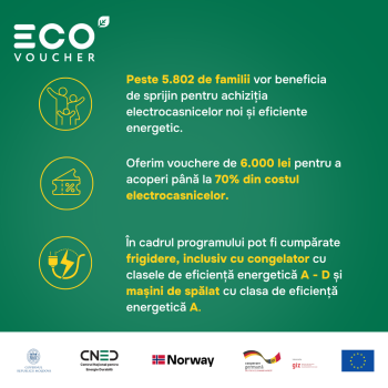 Programul EcoVoucher are drept scop sprijinirea gospodăriilor vulnerabile din punct de vedere energetic, reducerea consumului de energie și diminuarea cheltuielilor gospodăriilor. Fiecare voucher are o valoare de 6.000 de lei și poate acoperi până la 70% din costul unui aparat nou. Acestea pot fi utilizate în perioada sesiunii active în rețeaua magazinelor partenere, care oferă livrare gratuită și preluarea echipamentului vechi pentru reciclare.