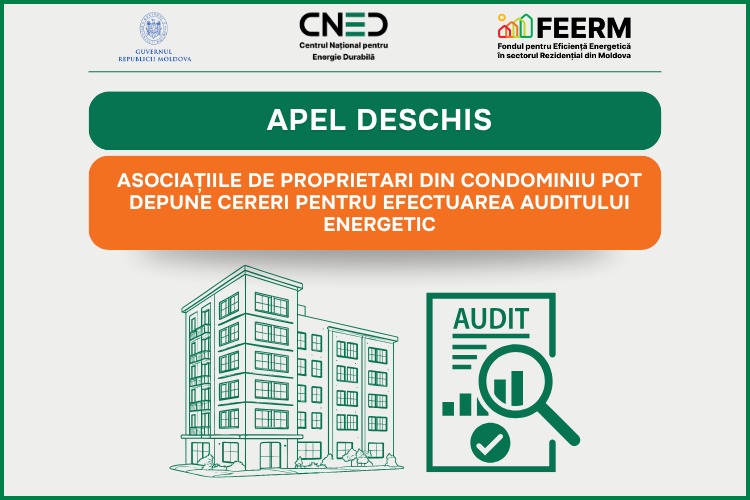 27 martie 2026, Chișinău - Centrul Național pentru Energie Durabilă (CNED) anunță lansarea apelului de depunere a cererilor de participare pentru efectuarea Rapoartelor de audit energetic pentru blocurile locative multietajate gestionate de Asociațiile de Proprietari din Condominiu (APC).