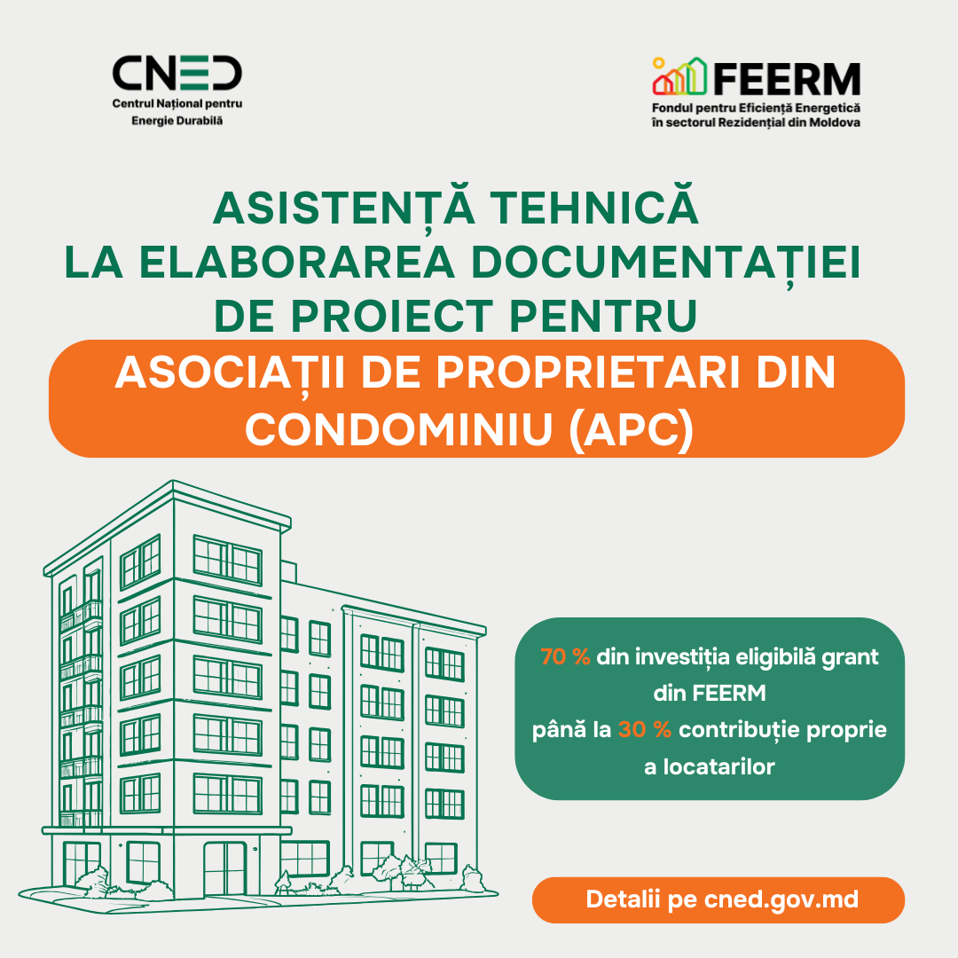 28 ianuarie 2025, Chișinău - Centrul Național pentru Energie Durabilă (CNED) anunță startul procesului de depunere a dosarelor de aplicare pentru selectarea Asociațiilor de proprietari din Condominiu (APC), pentru a beneficia de servicii de elaborare a documentației de proiect (inclusiv expertiza tehnică a clădirii și elaborarea devizelor pentru lucrări) pentru implementarea măsurilor de eficiență energetică și de valorificare a surselor regenerabile de energie cofinanțate din Programul Fondul pentru Eficiență Energetică în sectorul Rezidențial din Moldova (FEERM).